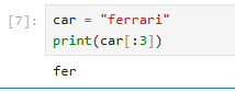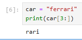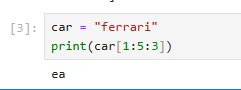 For example, below, we wanted to get the values starting from the 1st index to the 5th index in the variable car by going in 3 steps.