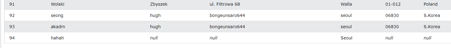 VALUES ('seong', 'hugh', 'bongeunsaro644', 'seoul', '06830', 'S.Korea');