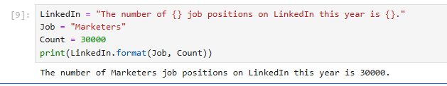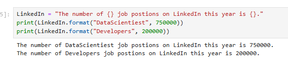 For example, there are two print functions below. Formatting was done according to its values and the string expression we wanted to come as output.